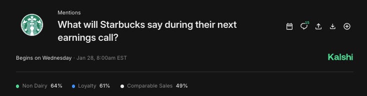 Current Kalshi YES pricing sits around 76¢, implying a high probability that “condiment bar” has become a fixture of Starbucks’ quarterly script. We believe this to be false (at-least going forward.)